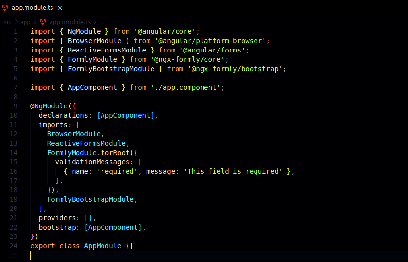 The forRoot() call is required at the application's root level. The forRoot() method accepts a config argument where you can pass extra config, register custom field types, wrappers, extensions and validation.
