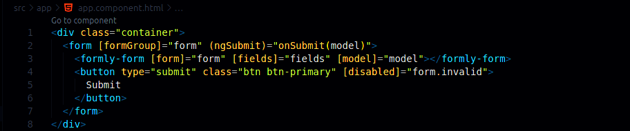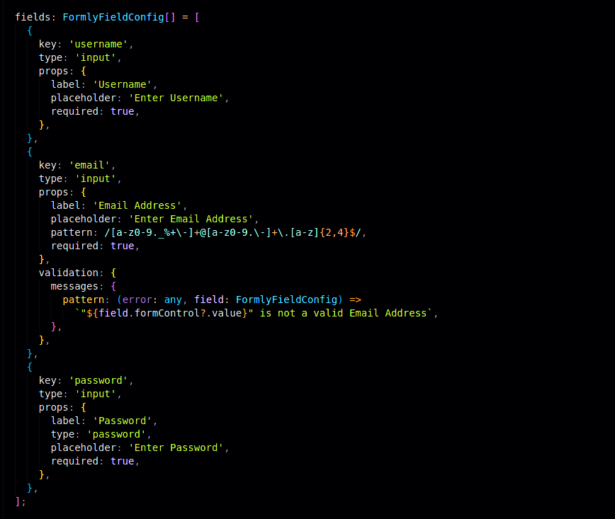 We will bind this FormlyFieldConfig array to the Template. This is a major part of what makes Formly so easy to use.