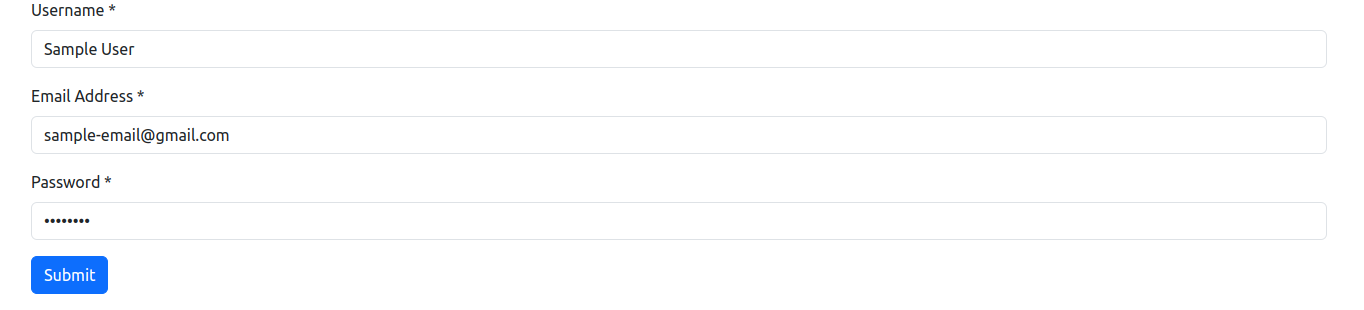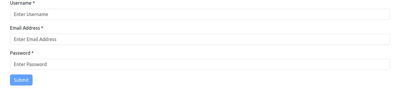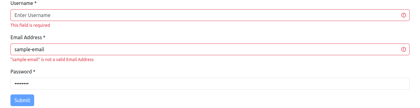 In this example code above, we have three fields Username, Email and Password. All fields are of input type and all fields are mandatory. Email field has Custom Email Validation logic to validate if the user inserts the email in the correct format. Password field has input text type as password so that entered password is masked and not visible as plain text.